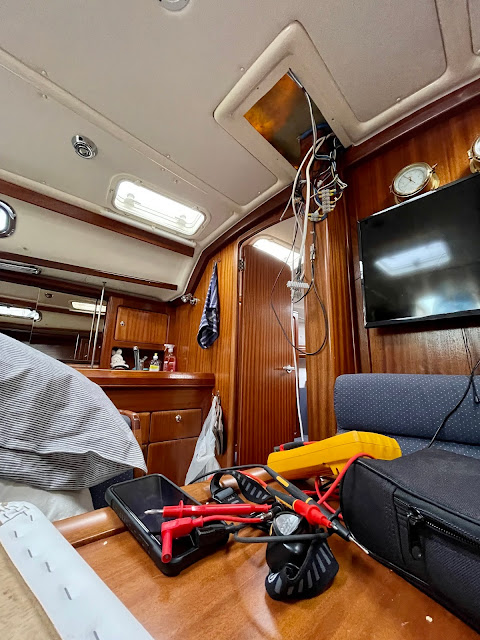 Vielä lauantai-iltana teimme veneessä sähkötöitä. Uusi tutka sai uudet liitännät ja ystävä monitaituri Kai auttoi näissä kovasti. Ihana, että on osaavia fiksuja ystäviä. Miehillä riitti puuhaa melko myöhälle saakka ja naisväki katosi hissukseen kotiin viettämään lauantaita.